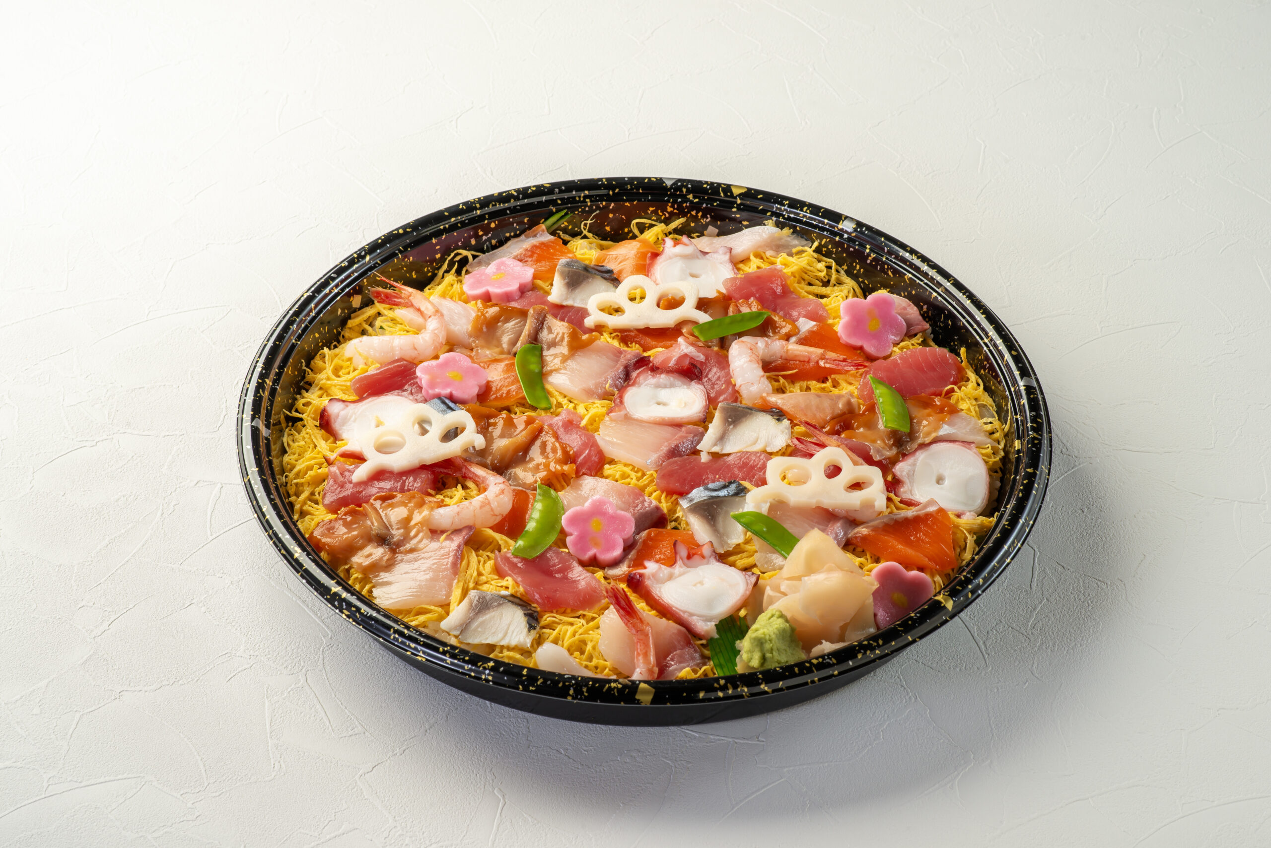 海の幸を贅沢に盛り込み、錦糸玉子や蓮根、梅生麩が華やぎを添える、